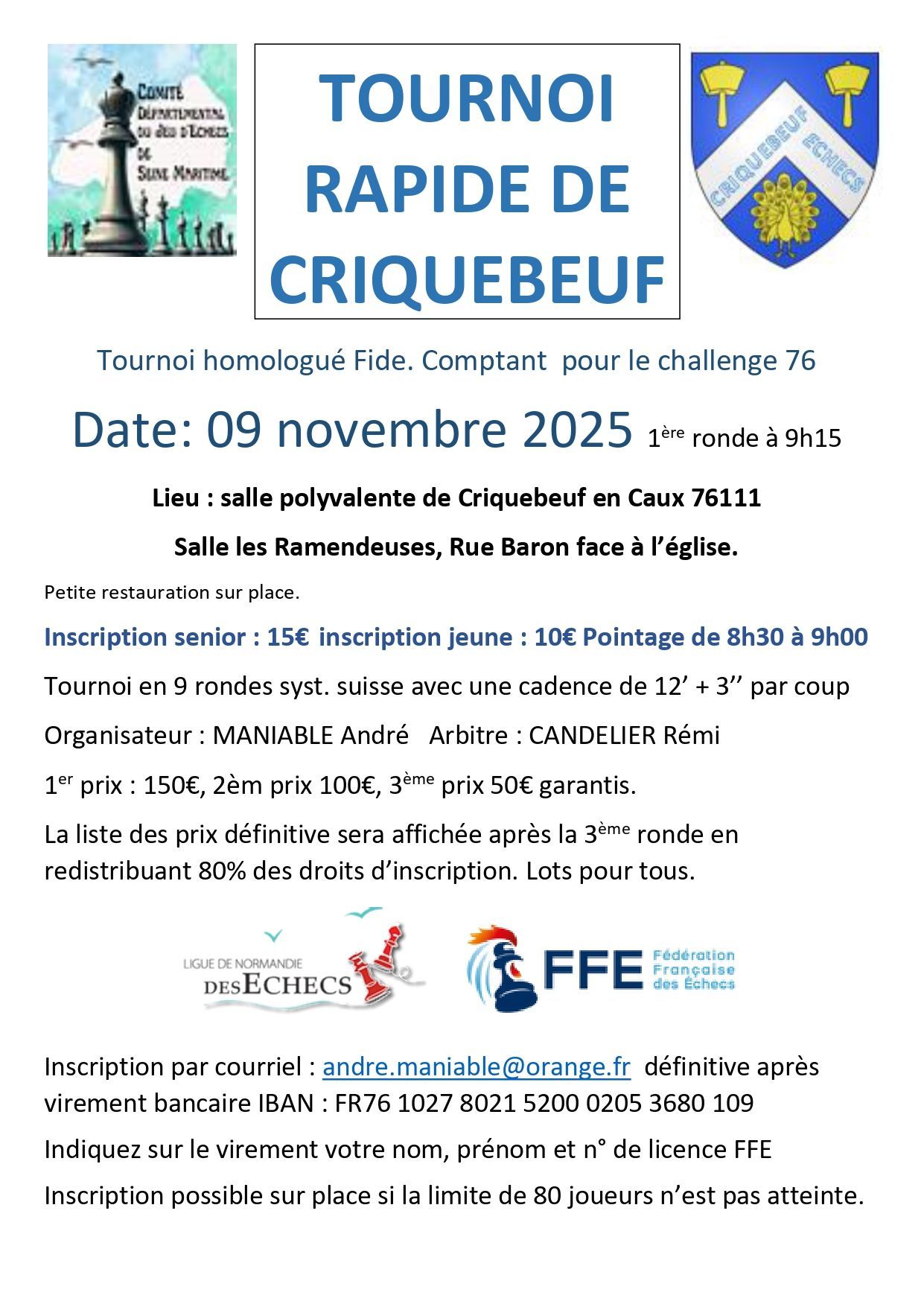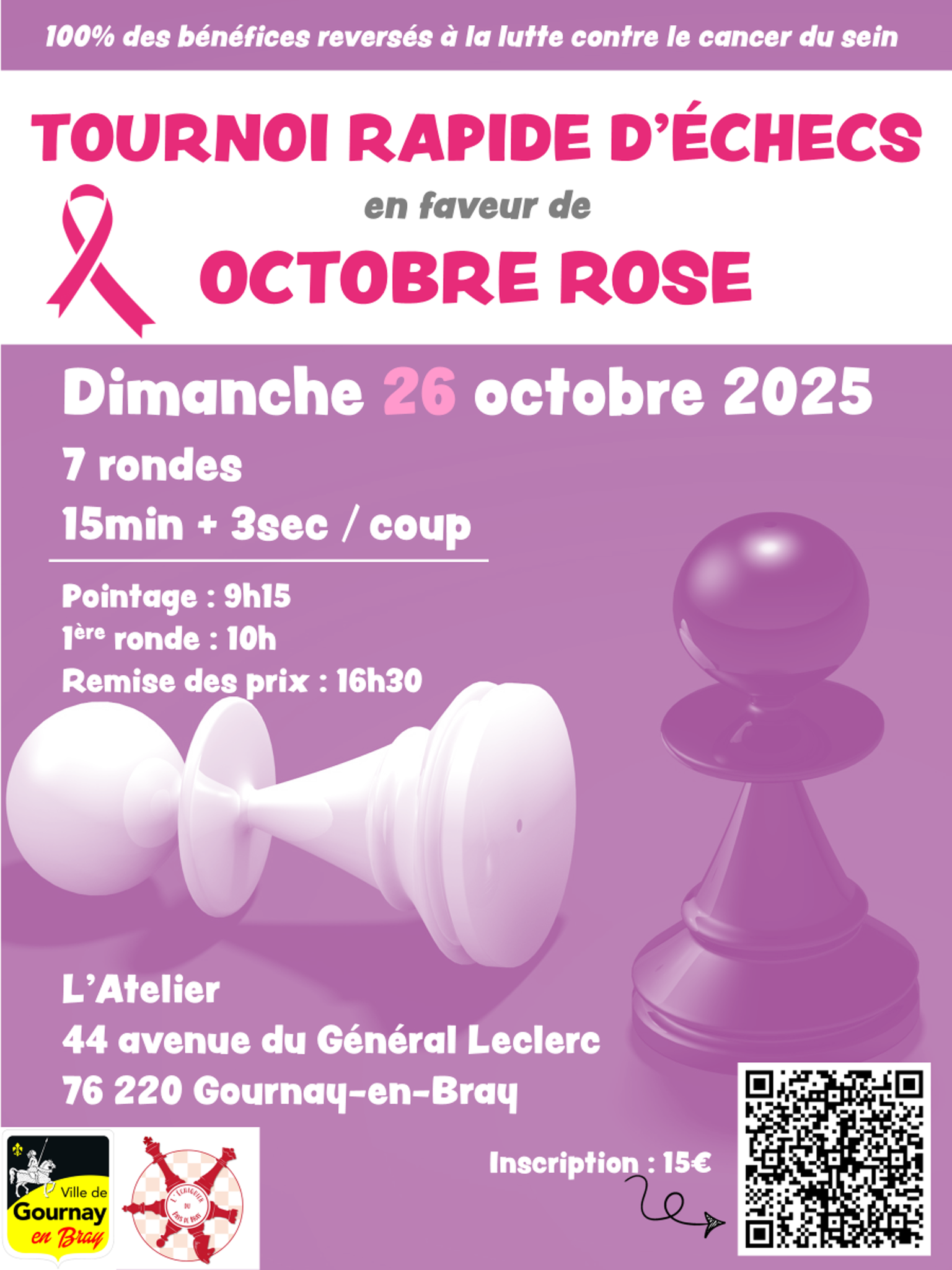 Le week-end dernier s'est tenu le premier Festival du Petit-Caux avec deux tournois A et B dans lesquels nos joueurs dieppois étaient bien présents. Dans le Tournoi principal, c'est le maître international Kamran Shirazi qui s'impose et le premier dieppois n'est pas loin avec la cinquième pour Jean Lefrançois qui continue de tutoyer les sommets. Dans le Tournoi réservé aux moins de 1800 elo, nous obtenons une belle 6ème place grâce à Camille Henin. Beau tournoi de David, Agnès, Marat, Marcus et Rémi qui engrangent de l'expérience avec de belles parties disputées. Félicitations au club du Petit-Caux pour la tenue et la réussite de ce Festival. Prochain tournoi le rapide d'orcher la tour !
