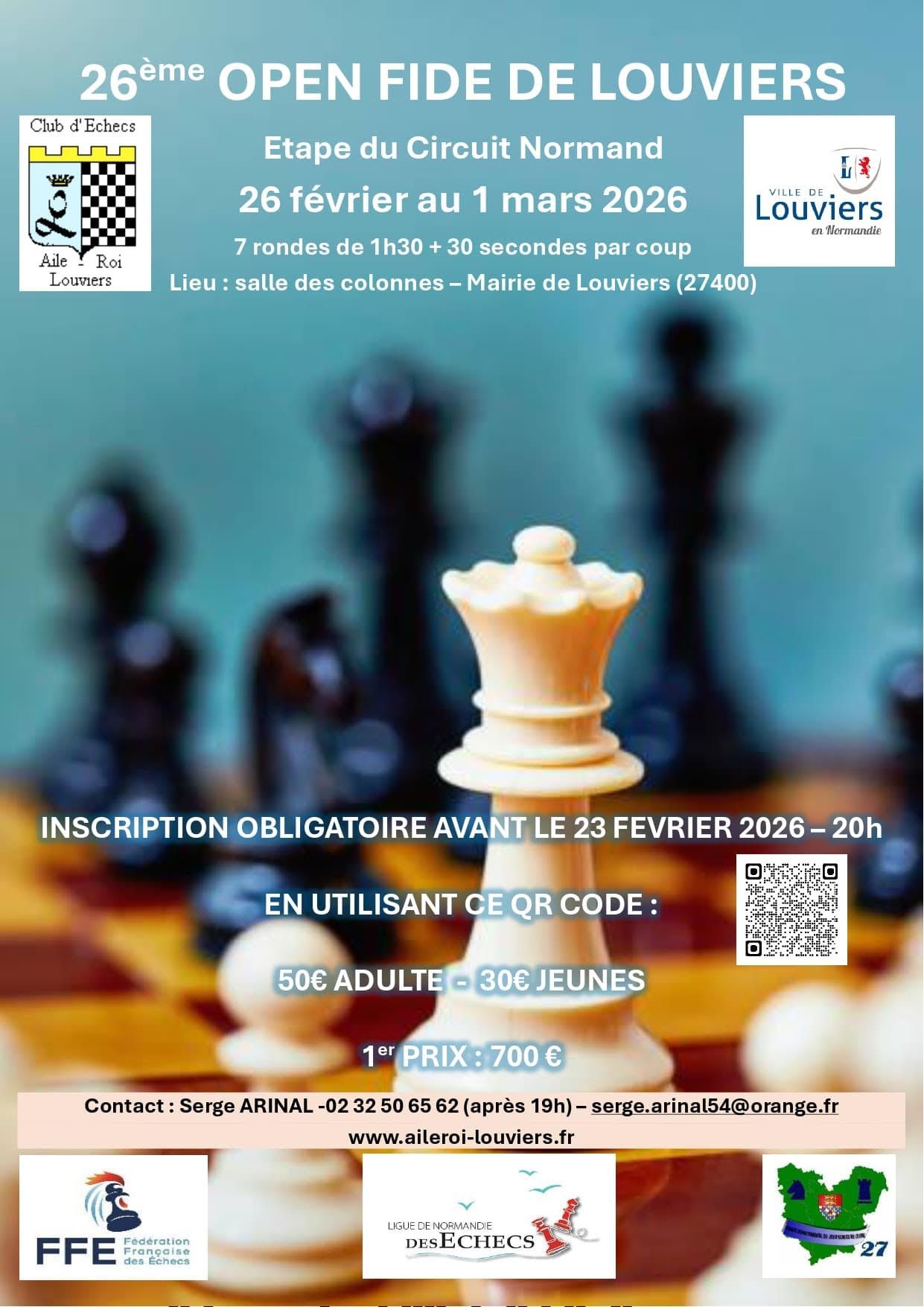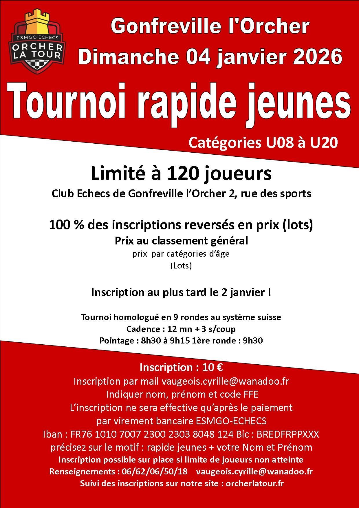 🏆 2ᵉ Rapide Jeunes de Gonfreville-l’Orcher Nombre de participants : 65 jeunes Podium : 🥇 Robin Fontaine (Orcher la Tour) – 8 pts 🥈 Clément Cozic (Orcher la Tour) – 8 pts 🥉 Gaël André (Échiquier Lexovien) – 7 pts 👏 Un grand merci au club de Gonfreville-l’Orcher / Orcher la Tour pour l’organisation et l’accueil de ce très beau tournoi jeunes. ♟️ Les jeunes de l’Echiquier Dieppois – Classement & messages Camille Henin – 13ᵉ, 6 pts Très beau tournoi avec un score solide. Une performance régulière face à une opposition relevée, bravo Camille 👏 Marat Dryzhuk – 20ᵉ, 5 pts Un tournoi combatif avec de belles parties accrochées. De l’expérience gagnée et une progression constante 👍 Joseph Postel – 28ᵉ, 5 pts Bon tournoi, sérieux et appliqué. Les points sont là et la marge de progression aussi, continue comme ça 💪 Eliot Mace Lu – 36ᵉ, 4½ pts Un tournoi encourageant avec de belles résistances. De bonnes choses montrées sur l’échiquier, bravo 👏 Thiago Montarou – 41ᵉ, 4 pts Un tournoi sérieux et appliqué. De l’expérience engrangée dans un tournoi très dense, félicitations 🙂 Liam Mace Lu – 43ᵉ, 4 pts De bonnes parties et une belle combativité. Continue à t’accrocher, les progrès sont visibles 💪 Gabriel Batista Lanoix – 46ᵉ, 4 pts Un tournoi solide avec de l’engagement jusqu’au bout. Une base intéressante pour la suite 👍 Basile Postel – 58ᵉ, 3 pts Un tournoi formateur dans un contexte relevé. L’essentiel est l’apprentissage et l’expérience acquise 👏