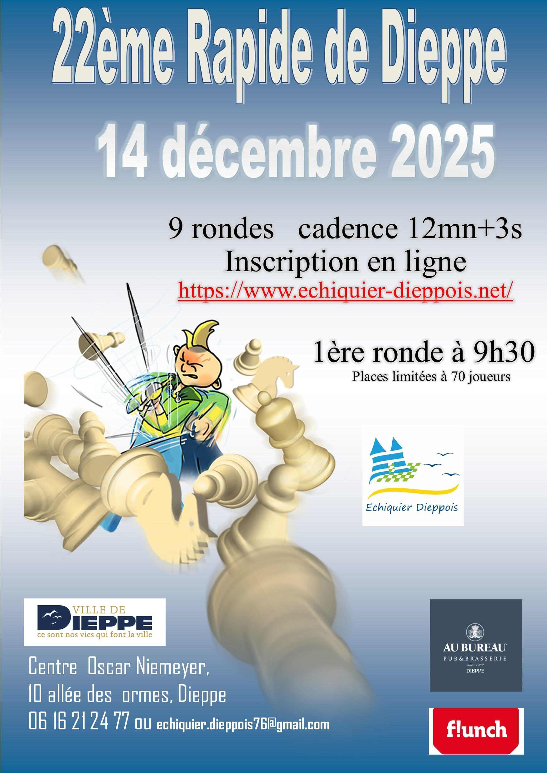 Le week-end dernier s'est tenu le premier Festival du Petit-Caux avec deux tournois A et B dans lesquels nos joueurs dieppois étaient bien présents. Dans le Tournoi principal, c'est le maître international Kamran Shirazi qui s'impose et le premier dieppois n'est pas loin avec la cinquième pour Jean Lefrançois qui continue de tutoyer les sommets. Dans le Tournoi réservé aux moins de 1800 elo, nous obtenons une belle 6ème place grâce à Camille Henin. Beau tournoi de David, Agnès, Marat, Marcus et Rémi qui engrangent de l'expérience avec de belles parties disputées. Félicitations au club du Petit-Caux pour la tenue et la réussite de ce Festival. Prochain tournoi le rapide d'orcher la tour !