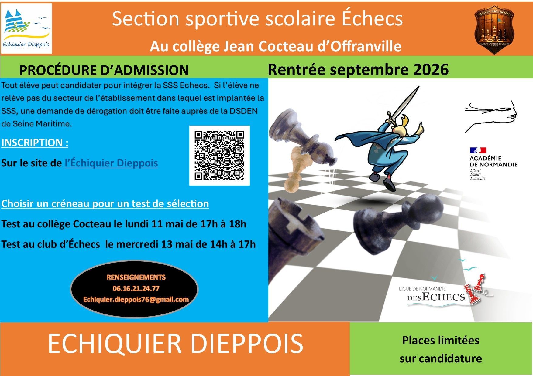 Le mercredi 25 mars s’est déroulée la finale académique d’échecs, réunissant les meilleures écoles et collèges qualifiés à l’issue des phases de zone. Une journée intense, marquée par un excellent niveau de jeu et un bel esprit sportif. À cette occasion, l’Échiquier Dieppois accompagnait fièrement deux établissements d’Offranville : l’école primaire Eloi Pruvost et le collège Jean Cocteau. 🏆 Une 3ème place méritée pour le collège Cocteau Le collège Cocteau réalise une très belle performance en décrochant la 3ème place du classement. Avec un bilan solide de 3 victoires, 2 défaites et 1 match nul, les collégiens ont su rivaliser avec les meilleures équipes académiques. Cette réussite vient consacrer le travail de la section sportive scolaire du collège, mais également l’engagement collectif de toute une équipe éducative de l'école Eloi Pruvost mobilisée autour du projet échiquéen. je remercie également Monsieur Joliton principal du collège Cocteau qui nous a fait confiance. L'aventure ne fait que commencer !! ♟️ Une dynamique construite dès le primaire Le résultat du collège s’inscrit dans une continuité logique grâce au travail remarquable mené en amont par l’école primaire Eloi Pruvost. Tout au long de l’année, des ateliers et des tournois sont proposés aux élèves, permettant une progression régulière et un véritable engouement pour la discipline. L’Échiquier Dieppois contribue également à cette dynamique en apportant son expertise lors de cycles d’intervention, afin de préparer les élèves aux exigences de la compétition. 👏 Une belle 6ème place pour l’école Pruvost L’école Pruvost se classe à une honorable 6ème place. Un résultat qui ne reflète pas totalement leur engagement, puisque l’équipe s’est battue tout au long de la compétition dans le haut du classement. La défaite lors du dernier match a malheureusement empêché une meilleure position finale. 📊 Classements Collèges Collège Saint Joseph - Le Havre (17 pts) Collège Marcel Gambier - Lisieux (17 pts) Collège Cocteau - Offranville (13 pts) Collège Georges Brassens - Epouville (12 pts) Collège Jean Baptiste de la Salle - Rouen (11 pts) Collège Jean Rostand - Evreux (10 pts) Collège Lucie Aubrac - Isneauville (9 pts) Collège Sévigné - Flers (7 pts) Écoles École Saint Roch - Le Havre (18 pts) École Privée Notre Dame - Carentan-les-Marais (15 pts) École Bord de Mer - Urville-Nacqueville (15 pts) École Mont Cauvaire (13 pts) École La Guéroulde - Breteuil (13 pts) École Pruvost - Offranville (12 pts) École Sarceaux (11 pts) École Michelet - Evreux (11 pts) École Rostand - Sotteville-lès-Rouen (10 pts) École Gustave Blouet - Baudré (10 pts) École Sacré Cœur - Ouistreham (10 pts) École de l’Oseraie - Remilly-les-Marais (6 pts) 🎯 Une fierté collective Ces résultats illustrent parfaitement la qualité du travail mené sur le territoire, de l’école primaire jusqu’au collège. Ils témoignent aussi de l’importance des partenariats entre établissements scolaires et clubs, au service de la réussite des jeunes joueurs. Félicitations à tous les participants pour leur engagement et leur esprit sportif, ainsi qu’aux encadrants pour leur investissement tout au long de l’année ! Si vous souhaitez que votre enfant intègre la section scolaire sportive du collège Cocteau, il y aura des sélections proposées en mai 2026.