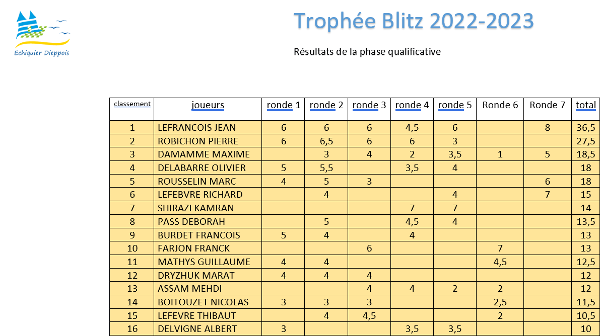 Le week-end dernier s'est tenu le premier Festival du Petit-Caux avec deux tournois A et B dans lesquels nos joueurs dieppois étaient bien présents. Dans le Tournoi principal, c'est le maître international Kamran Shirazi qui s'impose et le premier dieppois n'est pas loin avec la cinquième pour Jean Lefrançois qui continue de tutoyer les sommets. Dans le Tournoi réservé aux moins de 1800 elo, nous obtenons une belle 6ème place grâce à Camille Henin. Beau tournoi de David, Agnès, Marat, Marcus et Rémi qui engrangent de l'expérience avec de belles parties disputées. Félicitations au club du Petit-Caux pour la tenue et la réussite de ce Festival. Prochain tournoi le rapide d'orcher la tour !