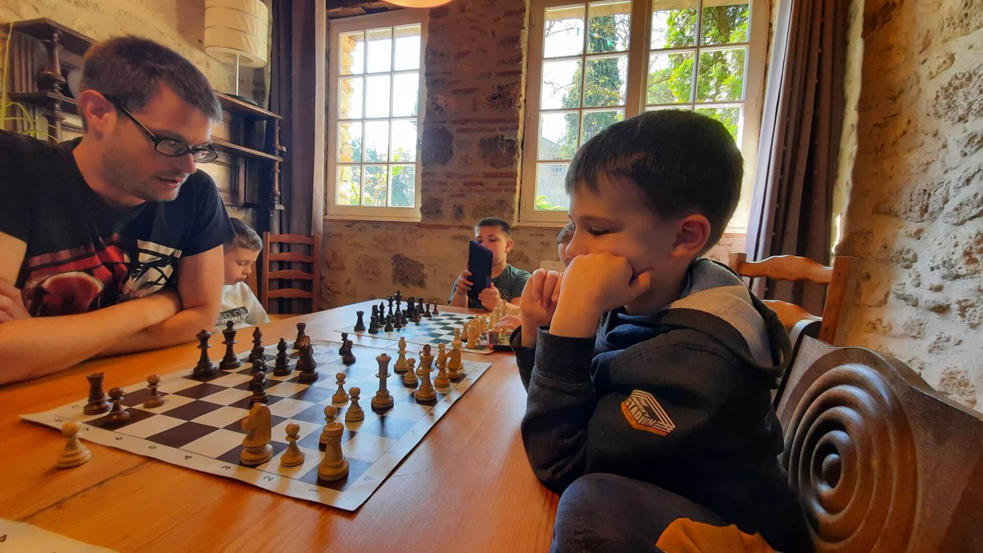 Olivier, notre entraîneur, analyse et dissèque les parties, encore et encore. Ainsi, les jeunes joueurs progressent et s’affirment, encore et encore. Certaines familles sont présentes et Carine s’empare de l’intendance des repas et de leur confection avec élégance et maestria ! Marius élimine Olivier dans un match épique et tendu et s’envole en finale de notre tournoi de Ping Pong. Hélas, il s’incline face à son papa. Décidément, zut alors, cet homme est trop fort ! Marius prendra sa revanche aux échecs. Sarah, notre unique et adorable représentante féminine, obtiendra prochainement le classement FIDE qu’elle attend : autant de jolies parties et de points accumulés pour la première fois à ce niveau. Rémy envoie ses parties à son papa chaque soir. Il rencontre les grands yeux bleus d’Olivia dans lesquels il semble plonger ! Ils se taquinent et se sourient. Ils ont tous deux 14 ans. Ferréol féérique, n’a que 5 ans chez les U8 et annonce déjà des difficultés énormes à ses adversaires de même catégorie dans 3 ans !