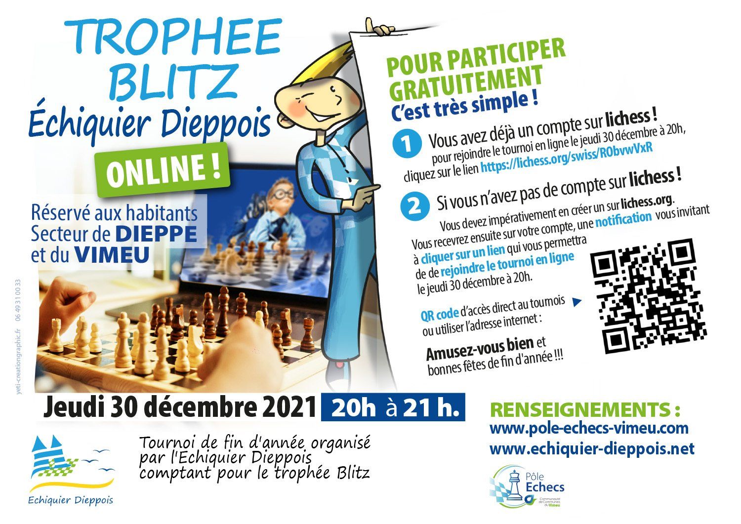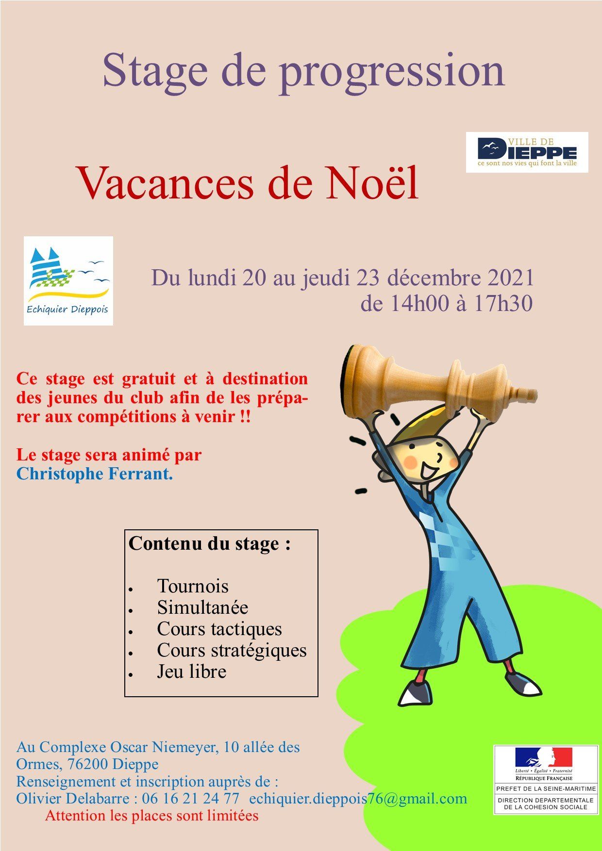 Retour sur notre stage Halloween ensorcelant ! 🎃👻 Quel succès pour notre traditionnel stage Halloween de l'Échiquier Dieppois, qui s'est tenu du 20 au 24 octobre ! Plus de vingt enfants ont répondu présent, transformant l'ambiance avec des citrouilles et des toiles d'araignées. Les matinées étaient dédiées à l'entraînement aux échecs, tandis que les après-midis plongeaient dans l'univers d'Halloween avec des jeux de rôles passionnants comme le Loup-Garou et Donjons et Dragons. Une excellente préparation pour le Championnat de Seine-Maritime que nous organiserons les 22 et 23 novembre ! Le stage s'est conclu en beauté par un tournoi de Blitz où tout le monde était déguisé. Un grand merci à nos partenaires Flunch et le Bureau pour leur accueil pendant la pause déjeuner ! Notez la prochaine date : Stage du 23 au 27 février 2025 !