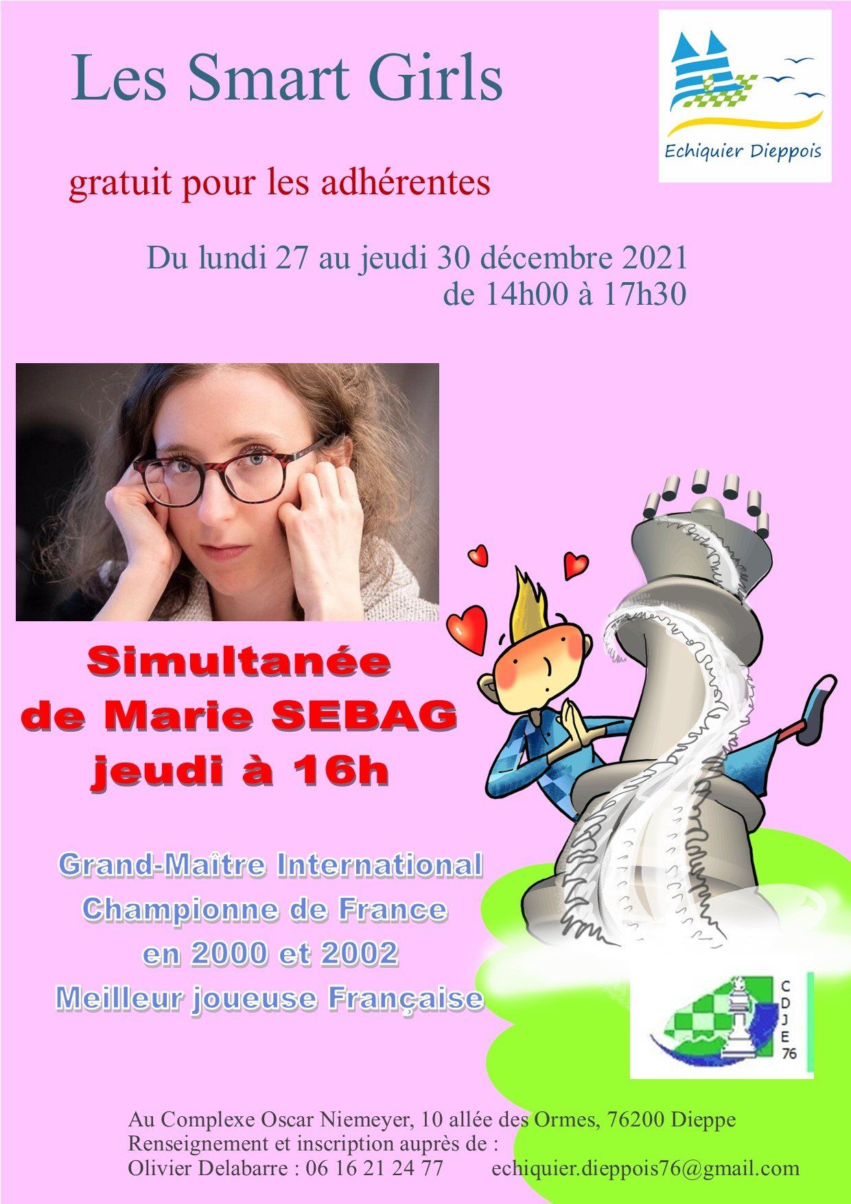 Public visé : jeunes filles scolarisées dans les écoles QPV, âgées de 6 à 14 ans. 16 premières inscrites bénéficieront de la gratuité totale (adhésion + licence). Le créneau sera animé par une jeune joueuse du club de 15 ans (plusieurs fois qualifiée au championnat de France) licenciée au club, en cours de formation DIFFE, accompagnée par un entraîneur expérimenté du club. L’objectif est de créer une dynamique féminine autour du jeu d’échecs, d’encourager