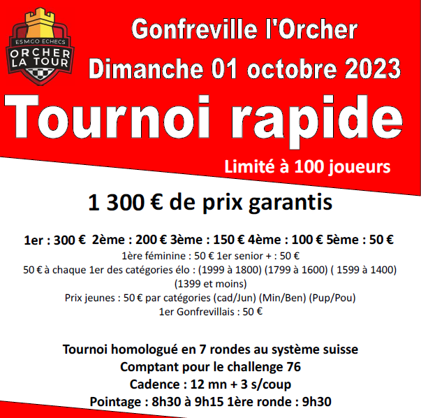 Comme les années précédentes, ce tournoi compte pour le challenge 76 dont le prochain rapide aura lieu le 10 décembre à Dieppe