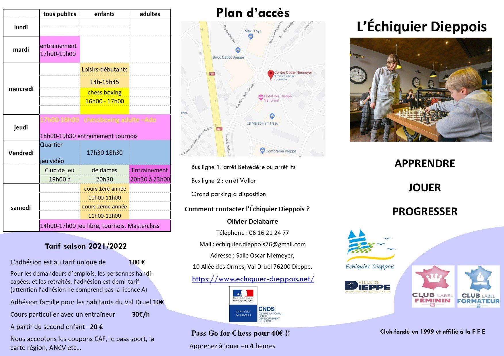 Public visé : jeunes filles scolarisées dans les écoles QPV, âgées de 6 à 14 ans. 16 premières inscrites bénéficieront de la gratuité totale (adhésion + licence). Le créneau sera animé par une jeune joueuse du club de 15 ans (plusieurs fois qualifiée au championnat de France) licenciée au club, en cours de formation DIFFE, accompagnée par un entraîneur expérimenté du club. L’objectif est de créer une dynamique féminine autour du jeu d’échecs, d’encourager