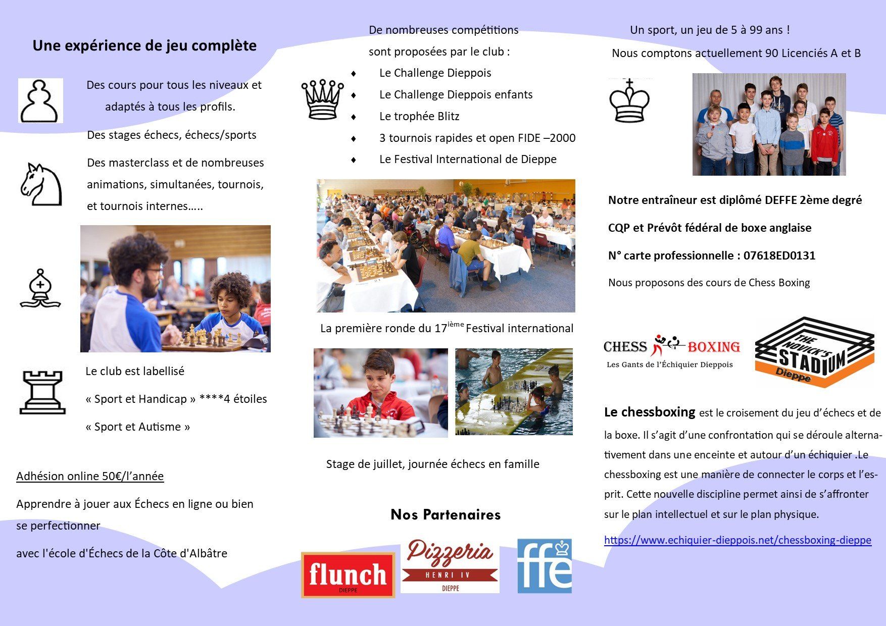 🏆 Festival international d’échecs de Dieppe 2025 : une édition record et pleine d’émotions ! Quelle semaine ! Du 22 au 30 août, plus de 350 joueuses et joueurs venus de tous horizons se sont affrontés dans la salle des congrès et au Casino de Dieppe. Et pour cette 21e édition, l’Échiquier Dieppois peut être fier : jamais nous n’avions connu d’aussi beaux résultats ! 🔥 Deux Dieppois sur les podiums ! Dans l’Open des Rois (+50 ans), François Burdet signe une magnifique 3e place. Dans l’Open B, c’est Férreol Pussiau qui monte lui aussi sur le podium, en terminant 3e. 👏 Mais les belles performances ne s’arrêtent pas là : En Open A, Jean Lefrançois décroche la 31e place et devient le meilleur Dieppois de la catégorie. Toujours en Open A, Jules Pace brille avec trois prix de meilleure performance (rondes 3, 7 et 8), tandis que Charles Pace réalise un solide tournoi avec 4,5 points. 💪 Dans l’Open B, nos Dieppois ont montré les muscles ! Paul Allain, champion de chessboxing, termine dans le top 10 (10e place). Sacha Pont (14e), Camille Hénin (16e), Paul Amichaud (17e) et Benjamin Mazzarèse (27e) et jules Dodin 28ème complètent ce très beau tableau. Mention spéciale aussi à Alain Goacolou, Jules Blosseville, Léo Allard, Nour et Yehya Feltane, qui décrochent la moitié des points, preuve d’une belle régularité. 🎯 Un travail d’équipe qui paye ! Les résultats sont là : de nombreux joueurs de l’Échiquier Dieppois ont gagné des points ELO, mais surtout en confiance et en expérience pour attaquer la nouvelle saison. Le programme d’entraînement à l’année porte ses fruits, et la motivation de tous promet encore de grands moments à venir. ✨ Merci à toutes et tous pour cette édition inoubliable. L’avenir des échecs à Dieppe s’annonce radieux, moderne et jeune !